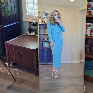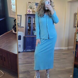 Weekenders Ribbed Straight Skirt & Top With Separated Buttons and Pockets