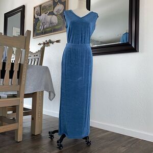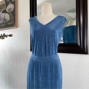 This 2 piece set is perfect for any occasion. It is made from an acetate blend fabric and is a size small petite. The color is a beautiful blue, with a v-neck and sleeveless cut. The skirt has a midi length and features a convertible design where you can also wear it as a strapless dress. With the design, you can customize the fit and length to create a look that is perfect for you. Wear it with sandals, flats, or your favorite pair of heels for a stunning look.