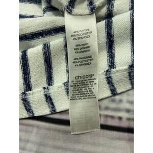 Elevate your casual style with this charming Weekends By Chicos striped shirt. Featuring a flattering V-neck and comfortable short sleeves, this shirt is perfect for weekend outings or relaxed days. The stretch fabric ensures a great fit, and the classic stripe pattern adds a touch of sophistication. Add this versatile piece to your wardrobe today!