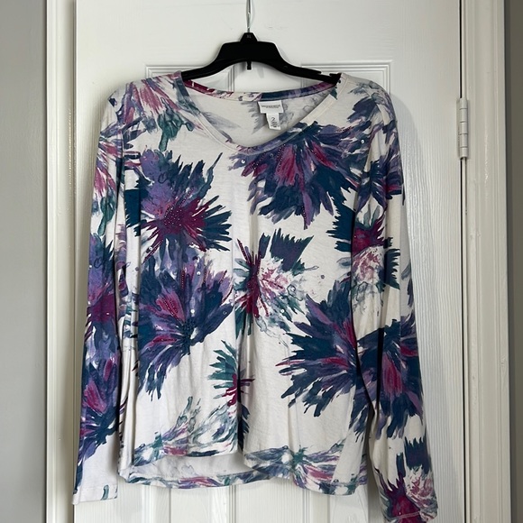 Chico size 2 (10/12) long sleeve tee shirt with burgundy looking rhinestone in flowers.