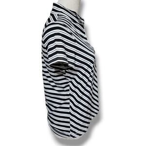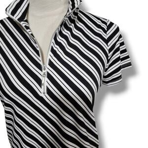 Pull on collared top from Weekends by Chico's. Black and white stripe. Zipper at neckline. Fitted with stretch. 92% Polyester, 2% Spandex. In excellent condition. Size small (Chico's size 0).