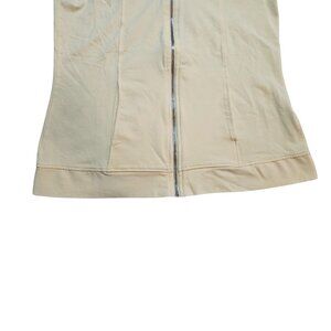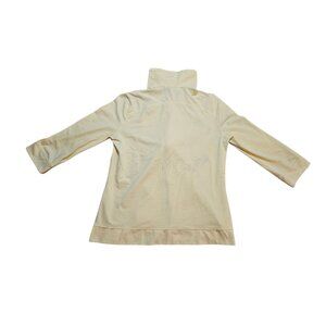 This Weekends by Chico's light yellow zip-up is a lightweight, comfy layering piece made from a 95% cotton, 5% spandex blend—soft with a bit of stretch for ease of movement. It features a zip front, pockets, and slightly cropped sleeves (not quite full-length, measuring 16.5"). Perfect for spring or summer layering.