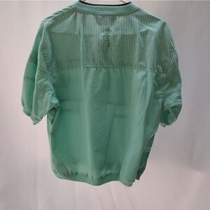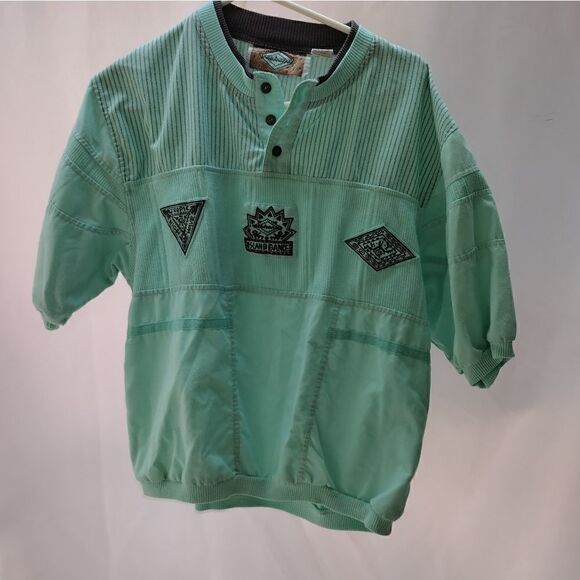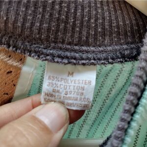 pullover, cotton blend shirt, 1/4 button. some pilling of fabric and a loose thread, see pictures. seam intact. pit to pit 21" length 24"