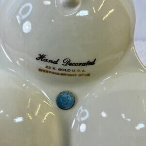 Vintage mid 20th century three compartment handled ceramic by Weeping Bright Gold. Hand decorated 22K gold finish. Made in USA. No chips or cracks. Dish finish is in great shape inside but has wear along the edges/rim. Handle finish shows wear. Overall good vintage condition. Candy & nut server with handle