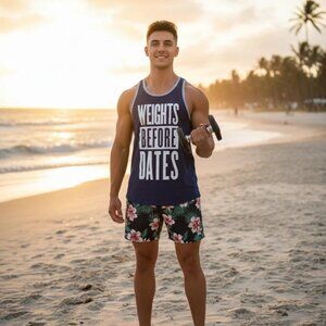 The product is a Weights Before Dates Bioworld Workout Tank Top in size Mens Medium. It features a solid blue color with a sleeveless design, crew neck, and a regular fit. Made from a cotton blend material, this graphic print tank top is machine washable and suitable for various seasons like summer, fall, and spring. The shirt is great for those who enjoy working out at the gym or prefer a casual beach look during the warmer months.