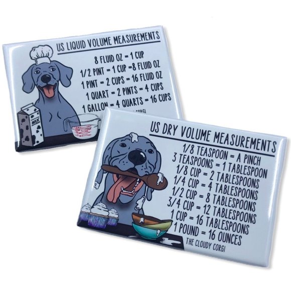 This handmade magnet set features hand illustrated dogs with handy conversion charts you can reference while cooking or baking!