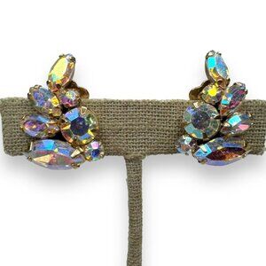 Weiss prong set Aurora Borealis Crystal clip on earrings in gold tone.