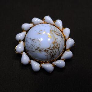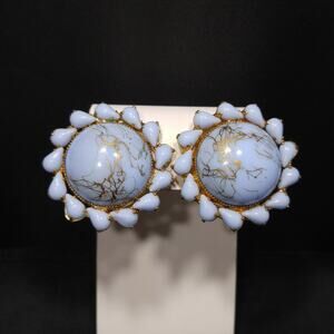 *Description: This is a beautiful pair of vintage Weiss light blue art glass floral earring set in gold plated metal from the 1950s. The light blue art glass cabochon has marbled gold within the design and is encircled with light blue glass tear drop cabochons, prong set. The Weiss hallmark is on one single earring and is in block letters without the copyright symbol on a raised cartouche. They are in beautiful condition and would be a great addition to your vintage jewelry collection or make a great vintage gift!