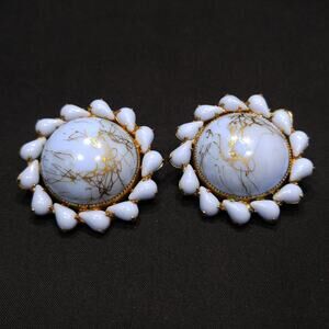 Weiss Light Blue & Gold Marbled Art Glass Earrings, Gold Plated, 1950s Vintage