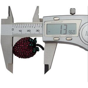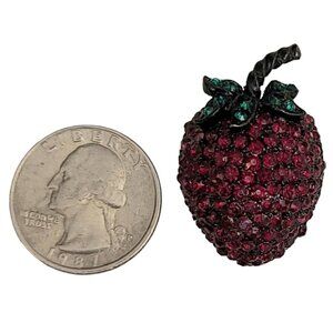 This exquisite Weiss Red Rhinestone Japanned Strawberry Brooch Pin measures approximately 1.3 inches in length and 0.8 inches in width. It features a beautifully crafted strawberry design, with a deep red color that is accented by sparkling rhinestones. This brooch pin is made by Weiss, a renowned jewelry company that is known for its high-quality and stylish designs. The back has a secure clasp closure ensuring that it stays securely attached to your clothing or accessory throughout the day.