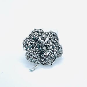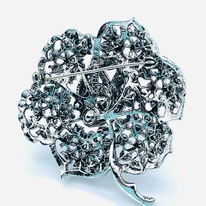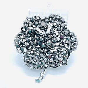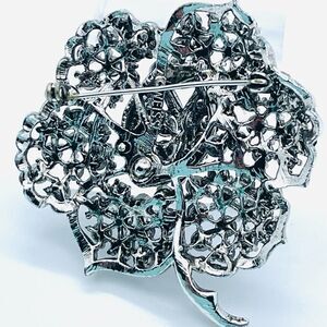 This large, beautifully made and intricate floral brooch is quite unique. The black rhinestones resemble jet and strategically placed on the japanned metal frame, the result is quite striking. Organic in design, with lovely soft curves and corners.
