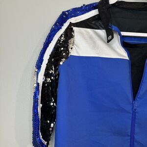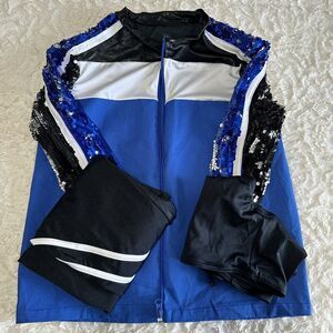 Hip hop dance costume 3pc set (jacket, pants and bartlett). This is child XL size. Never used for recital only tired on. No rips or stains. Excellent condition. Please check the measurements. Raglan sequins 3/4 sleeves, Elastic band on bottom of the pants. Full zip front jacket with one button closure around the neckline.