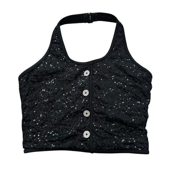 Stylish black crop top with sequins. Features button front. Perfect for dance or casual wear.