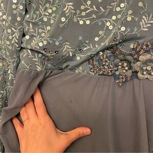 Poet sleeve dress with embroidered sequin vine mesh overlay