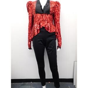 Gold sequin jacket with black lapels. Black fitted pants. Stylish and bold design.