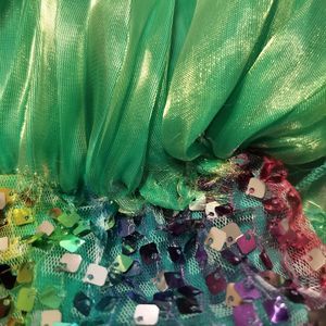 Iridescent organza gives this costume plenty of pizzazz. It wraps the waist and ties in a beautiful front bow. Rainbow sequin sparkles over a spandex camisole bodice with criss-cross back straps. The organza topskirt, tulle underskirt and spandex shorts are attached at the waist.