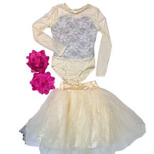 This elegant ivory tulle leotard dress features a delicate lace bodice with metallic underlay and long sheer sleeves, complemented by a striking hot pink flower accent at the waist. Style #8298. Ivory and silver. Size Large Child.