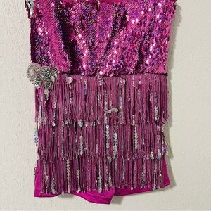 This stunning dance costume by Weissman features a sleeveless design with a round neckline, adorned with shimmering silver accents. The pink fringe at the hem adds a dynamic flair, perfect for captivating stage performances. Its fitted bodice ensures a sleek and elegant appearance, ideal for any dance routine.