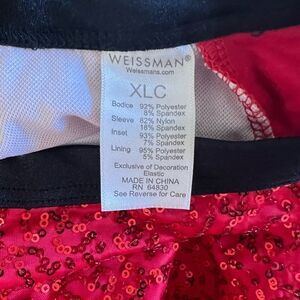 Striped short sleeves, cross strap detail, and briefs are shiny spandex