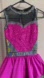 Sparkly purple bodice with black mesh accents. Iridescent trim and skirt detail. Perfect for dance performances.