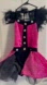 Velour pink and black dance outfit with feathered accents. Features shimmering sequins, bold embellishments and feathers.