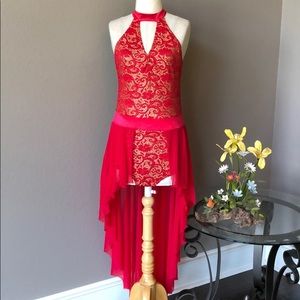 Weissman dance dress. Red with gold. High neck with long backed skirt. No snags