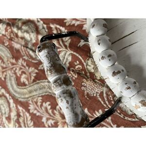 This serving tray is awesome- made of wood and metal handles. -white paint is chippy and distressed. Bun feet on bottom - no issues