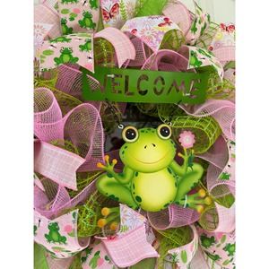 Welcome Frog Mesh Ribbon Spring & Summer Wreath Front Door Hanger Home Decor