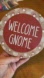 Welcome Gnome hanging wooden sign—burnt orange, white, tan colors