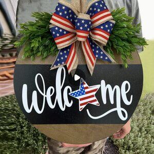 Welcome Patriotic Flag Front Door Hanging Sign Fourth of July Decor Wreath Gift