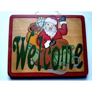 Holiday wood sign with Santa. Sticker on back. Circa 2000. Has some light age wear. Displays great. Ready to hang on your door or wall.