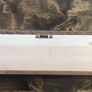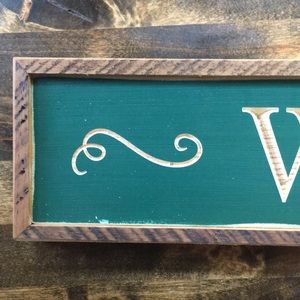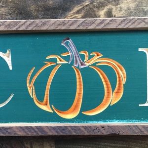 Perfect fall decor. Hand made. Rustic. Farmhouse style. Premium pine board. Framed with century old Barnwood. Can be set on shelf/mantle or hung using sawtooth hanger on back. Measures 28 5/8”L x 4 1/4” tall x 1” deep. Hunter green with orange pumpkin. Rustic. Nail heads visible on frame.