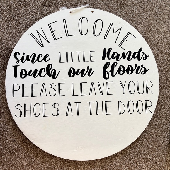 Round welcome sign with playful text. Perfect for entryways. Adds charm to your home decor.