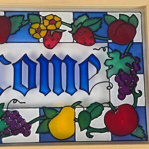"Welcome" Sign Painted Glass Fruit Motif Wooden Frame Kitchen Indoors Outdoors