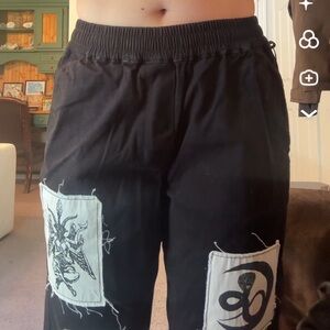 WELCOME skateboards skate pants. Sewn on patches. Straight leg pants. Keyring attached for accessibility. Elastic waistband for comfort. Men’s Small.