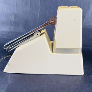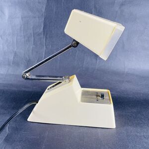 This Well Lite folding desk lamp is a great addition to any workspace. With adjustable features and a switch control style, it provides medium-intensity lighting in an off-white color. The lamp has a geometric design with a square shade shape and a black cord color. Made in Hong Kong in the 1960s, this vintage lamp is perfect for those who appreciate mid-century modern style. The lamp is corded electric and has an incandescent lighting technology. It is finished with a matte off-white color and is made of plastic. This lamp is an original piece and is not antique.