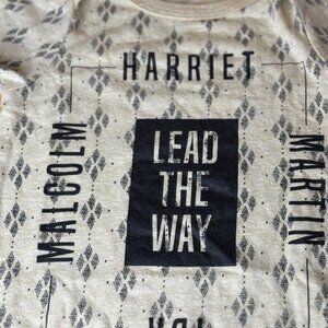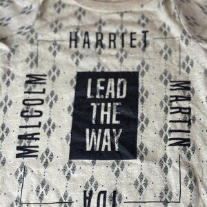 Empowering and stylish graphic onesie by Well Worn (Los Angeles), size 12 months. Features powerful Black history leaders including Harriet Tubman, Malcolm X, Martin Luther King Jr., and Ida B. Wells. Center text reads: LEAD THE WAY. Soft cream knit with geometric print overlay.