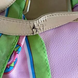 Parazul bag pink with green scarf. Wear and tear on handles. Leather peeling. Still has a lot of life in it. Priced accordingly.