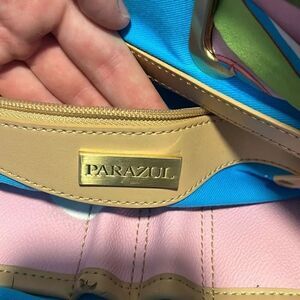 Well loved Parazul bag, pink, and green with scarf. See flaws in pictures.