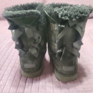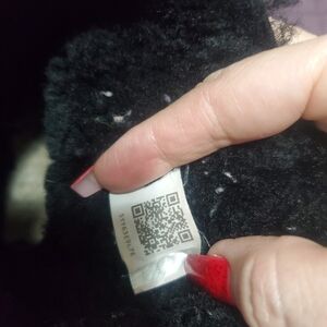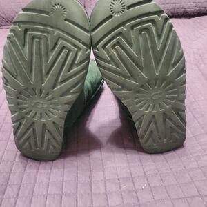 only worn with socks. a few stains/ash burns on toe area, cleaned only with ugg cleaner. pictures show lighter washed out black in sun they are darker. can send or add additional photos.
