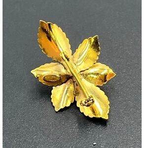 This brooch features a carved white flower (possibly celluloid) and gold-filled leaves.