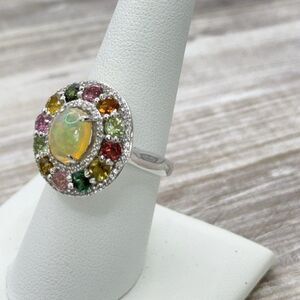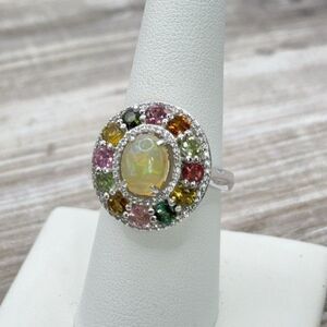 Welo Opal Ring W/ Multicolored Tourmaline Gemstones Zircon Halo Sterling Sz 7.75