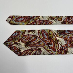 This imported tie from Italy showcases a vibrant mix of colors, including green, blue, orange, cream, brown, and maroon, making it a versatile accessory.
