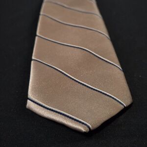 This elegant men's necktie features a classic striped pattern in a sophisticated satin finish. The tie is manufactured by Wembley, known for quality formal wear accessories. The leatherback construction provides added durability and a luxurious feel. Ideal for business attire, weddings, or any special occasion. The tie is in a soft beige color with dark blue stripes.