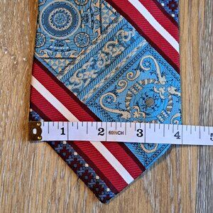 This tie could be considered patriotic in the mixture of red, white, and blues. It's wide diagonal stripes have their own pattern within. Vintage and made by Wemlon by Wembley. Suggested to wear with a blue, black, or grey suit. The width suggests a wide or traditional style. Nice pre-loved condition.