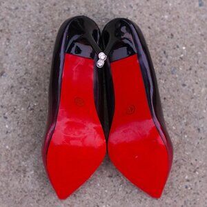 Color/Finish: They feature a dramatic ombre/gradient color effect starting with a bright Red at the toe and fading into a deep Black or Burgundy at the heel, all with a high-shine patent leather look.