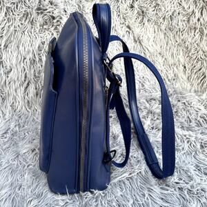 Blue vegan leather with brown nylon lining. Inside the bag are 2 main equal sized open pockets with a small middle zip pocket, one side zip on one side and 2 open smaller on the other.