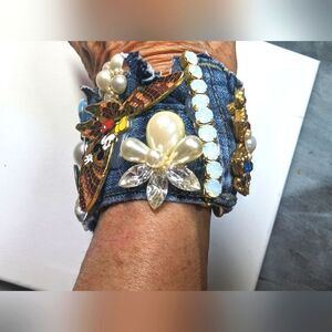 Another of my fun denim wristies. My Disney license in the '80s there is a Mickey Mouse on a butterfly that was also on a scarf and as a pin . The denim shows the zipper and a button says Old Navy. There's a star and two silver hearts on one side on the other side of pearl cluster, a line of chalk rhinestone chain and at the edge a gold maltese cross with stones. It is created on a 2-in signed cuff very pretty one of a kind.