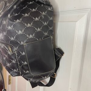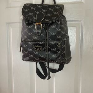 Wendy Keen Synthetic black and gray logo Backpack drawstring top closure.gold tone hardwares.front zipper pocket,two side pockets flop top snap closure. The inside lining has a side zipper two side pockets. Pre owned in good used condition normal wear small fading on the bottom of the bag see all pictures and description any questions please message.
