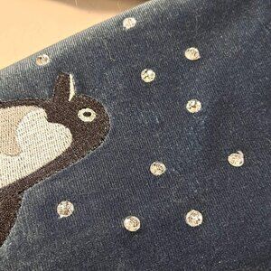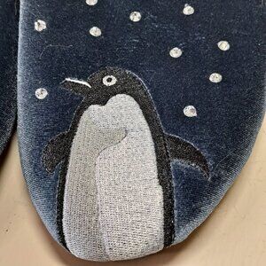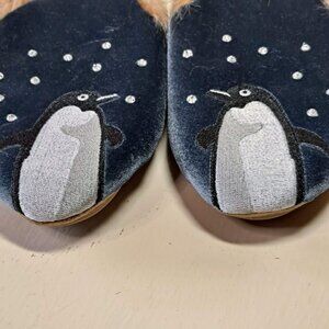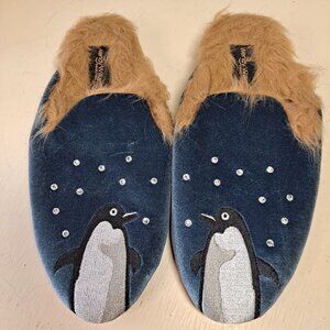 These cute slippers featured embroidered penguins on the front surrounded by a scattering of crystals "Stars on the Night Sky". The interior is lined in brown faux fur. The bottom has a rubber bottom with treads for security.